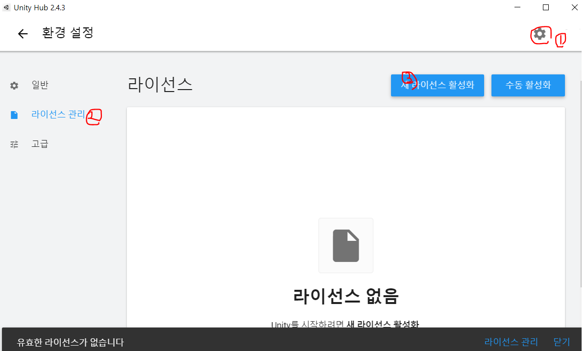 톱니바퀴를 누르고 라이선스 관리에 들어가서 새 라이선스 활성화를 누르자.