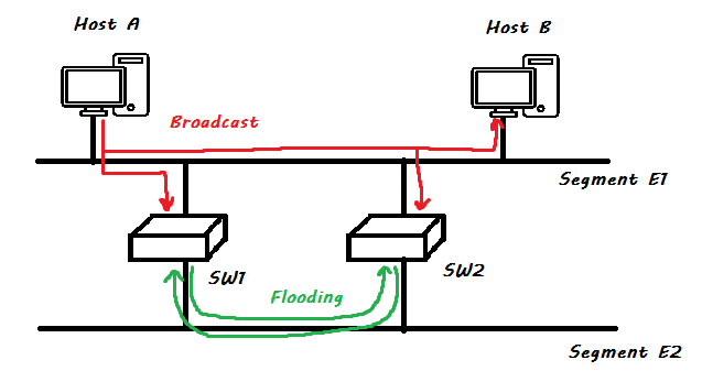 ① Host A에서 브로드캐스트 패킷을 뿌린다. (이더넷 특성 상 같은 세그먼트(E1)에 있는 모든 노드들은 브로드캐스트를 받게 된다.)