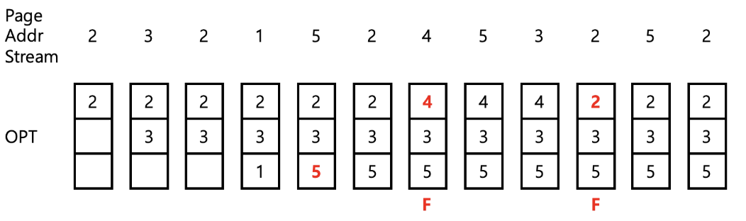 - 첫 번째 Page Fault : Page Addr Stream을 봤을 때, 미래에 1이 사용되지 않으므로 교체 대상
