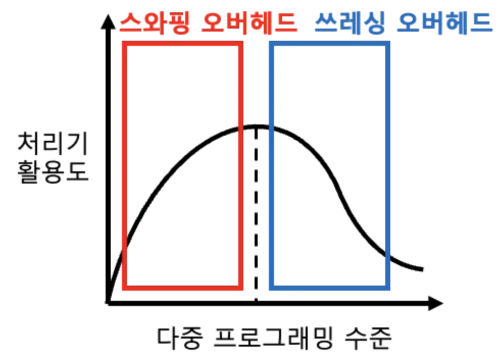 - 할당량이 많아질수록, 스와핑으로 소모되는 시간 증가 ⇒ 처리기 활용률 감소