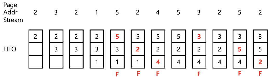 - Page Fault 발생시, 참조되는 페이지 번호를 Top에 두고, 오래된 페이지 번호를 제거(Pop)